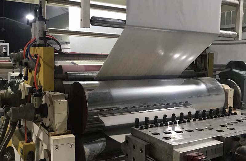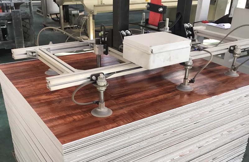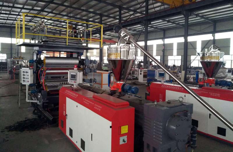 PVC石塑地板四輥加一輥生產(chǎn)線設(shè)備,擠出基材,熱敷彩膜裝飾層和耐磨層,實(shí)現(xiàn)一步法,在同一臺(tái)設(shè)備上同時(shí)完成。第一,表面可熱敷上各種不同顏色的彩膜裝飾層;第二,可直接在板材裝飾層上熱敷耐磨層;第三,可直接做上各種各樣浮雕木紋及各式各樣的花紋;第四,底層軟墊消音層,也可直接熱敷上去。以上四條均可同時(shí)在一條生產(chǎn)設(shè)備上完成多層結(jié)合為一體??蓽p少表層處理花紋,耐磨的設(shè)備。減少人工及設(shè)備的投資,大大降低PVC地板生產(chǎn)成本。
